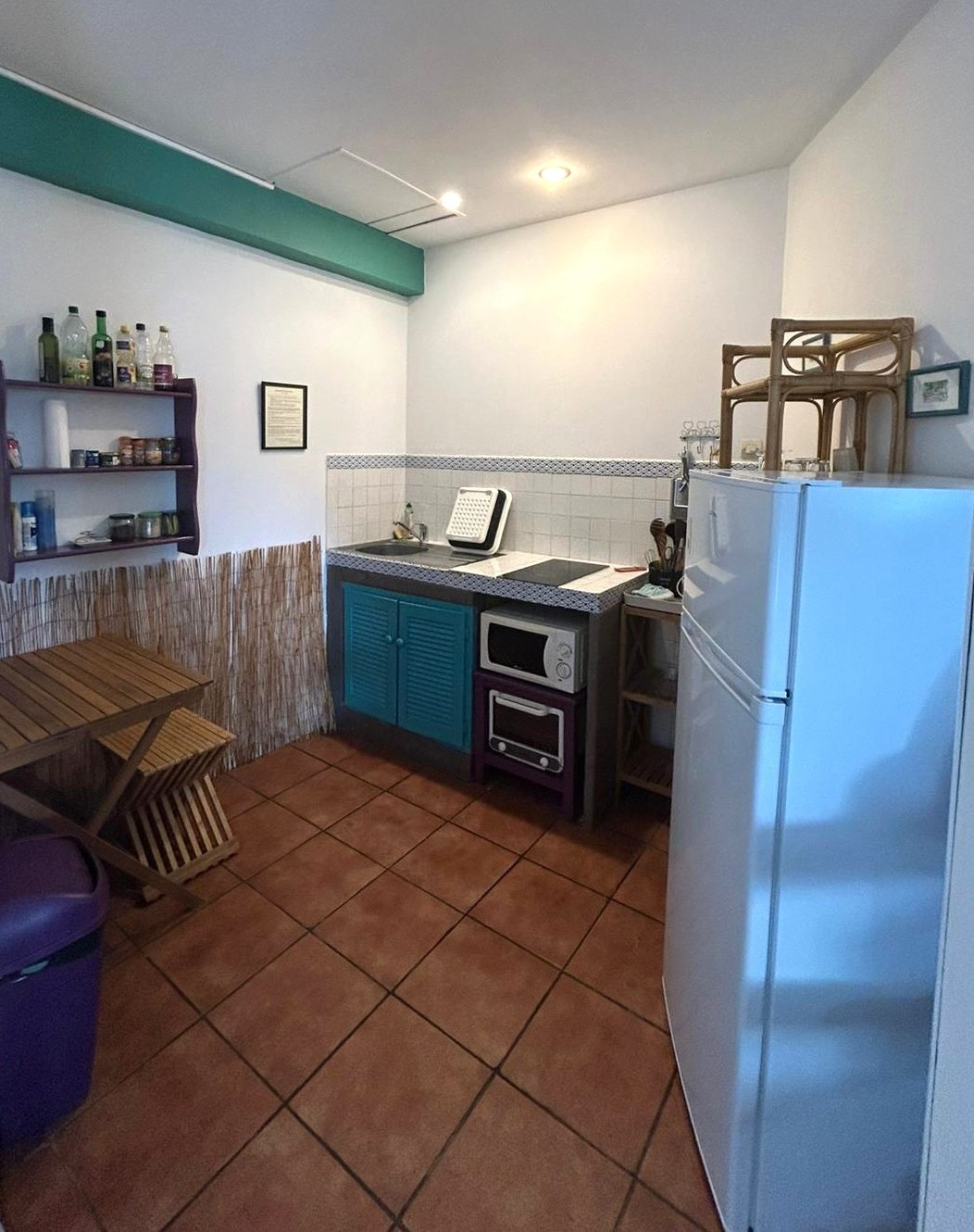 La kitchenette entièrement aménagée et équipée (four, four micro ondes, cafetière napolitaine (café moulu), grille pain, réfrigérateur avec congélateur, plaques vitrocéramique, ustensiles et vaisselle) vous permettra de vous sentir comme chez vous. Vous pourrez profiter de vos repas à l’intérieur comme à l’extérieur sur votre terrasse.