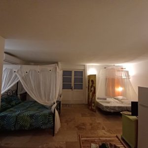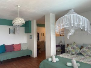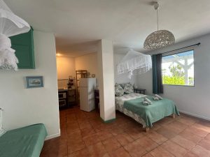 Ce studio de plain pied, climatisé comprend un coin nuit avec un lit 2 places (140×190), un lit une place d’appoint (90×190), les draps vous sont fournis gracieusement.