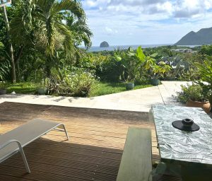 Situé au Diamant face au rocher et à la femme couchée, Ti coin de paradis est une villa créole au cœur d’un jardin tropical agrémenté de bananiers, ylang ylang, frangipanier, bougainvilliers…