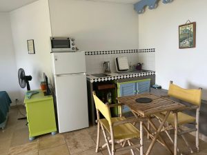 La kitchenette entièrement aménagée et équipée (four, four micro ondes, cafetière napolitaine (café moulu), grille pain, réfrigérateur avec congélateur, plaques vitrocéramique, ustensiles et vaisselle) vous permettra de vous sentir comme chez vous. Vous pourrez profiter de vos repas à l’extérieur sur votre terrasse.