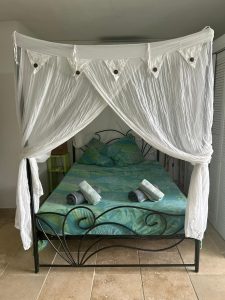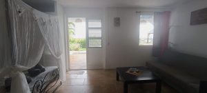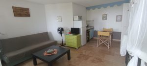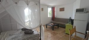 Ce studio de plain pied, climatisé comprend un coin nuit avec un lit 2 places (140×190), un clic clac d’appoint (140×190), les draps vous sont fournis gracieusement.